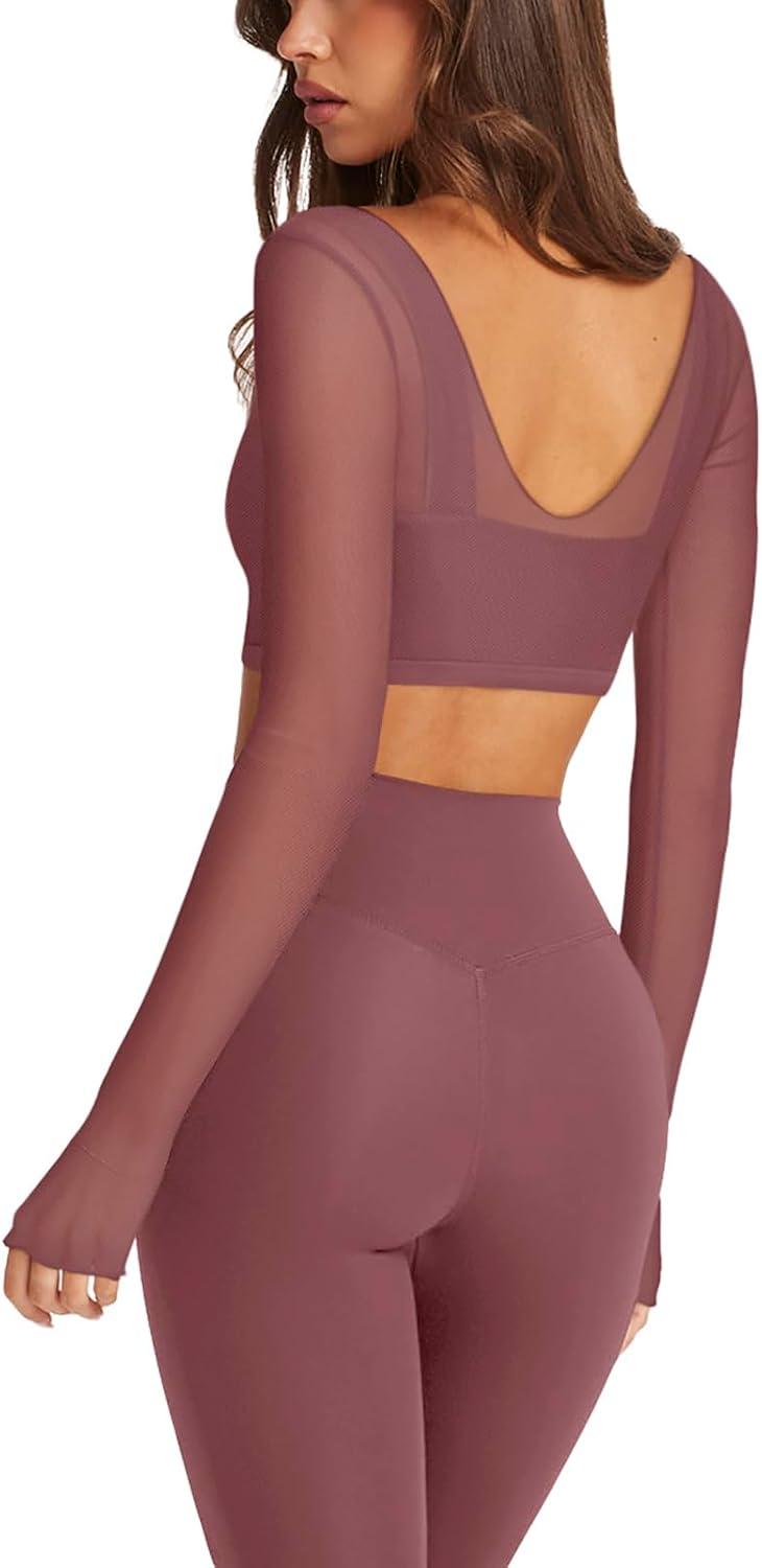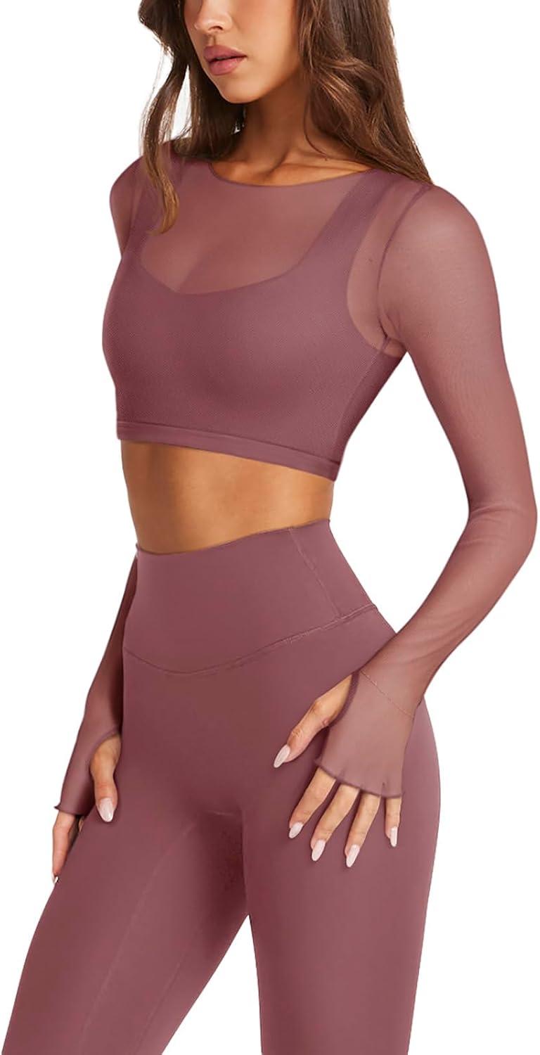 imageLASLULU Mesh Long Sleeve Crop Tops for Women Double Lined Workout Athletic Gym Shirts Cropped Tops with Built in BraMarsala