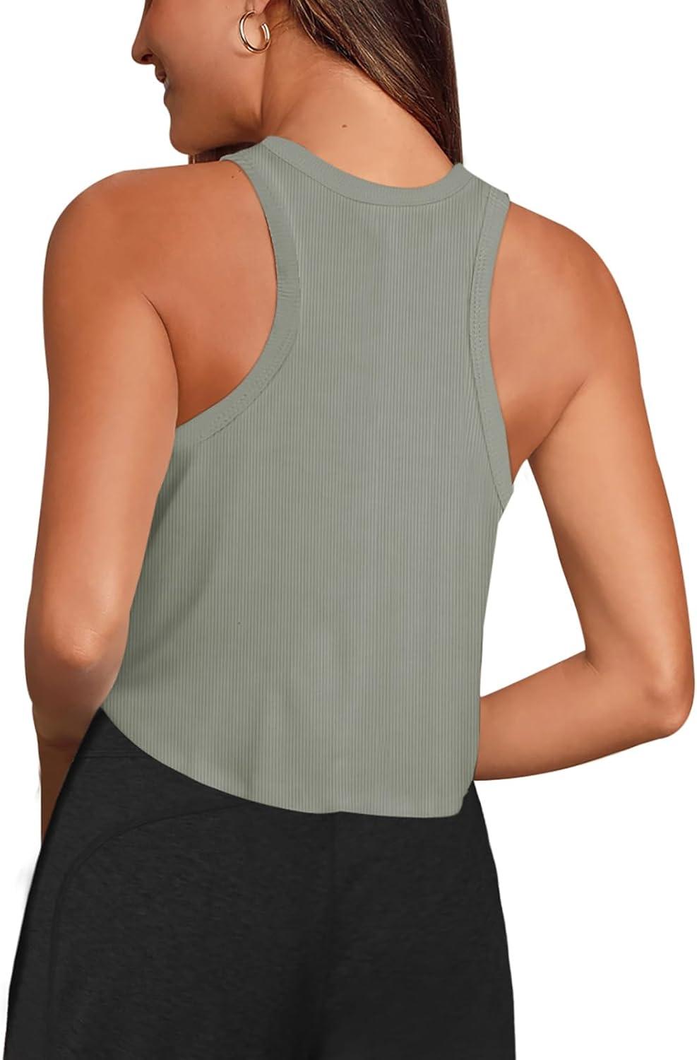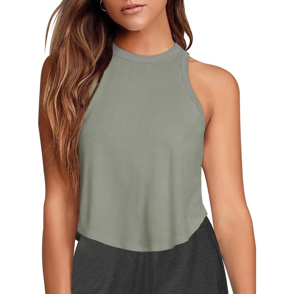 LASLULU Womens Crop Tops Sleeveless Workout Tops Halter Neck Flowy Athletic Shirts Cropped Tank Muscle Tank(Grey Green)