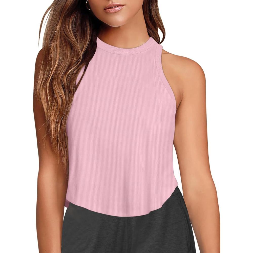 imageLASLULU Womens Crop Tops Sleeveless Workout Tops Halter Neck Flowy Athletic Shirts Cropped Tank Muscle TankParfait Pink
