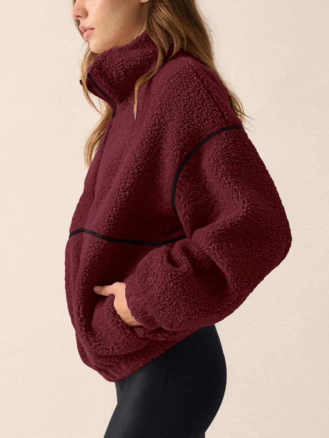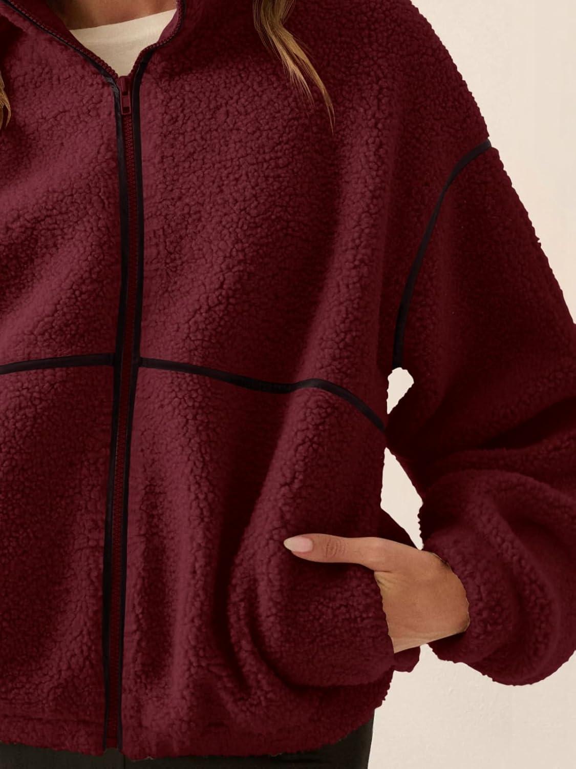 LASLULU Womens Fuzzy Sherpa Fleece Jacket Zip Up Oversized Sweatshirts Long Sleeve Winter Clothes Warm Sweater(Burgundy)