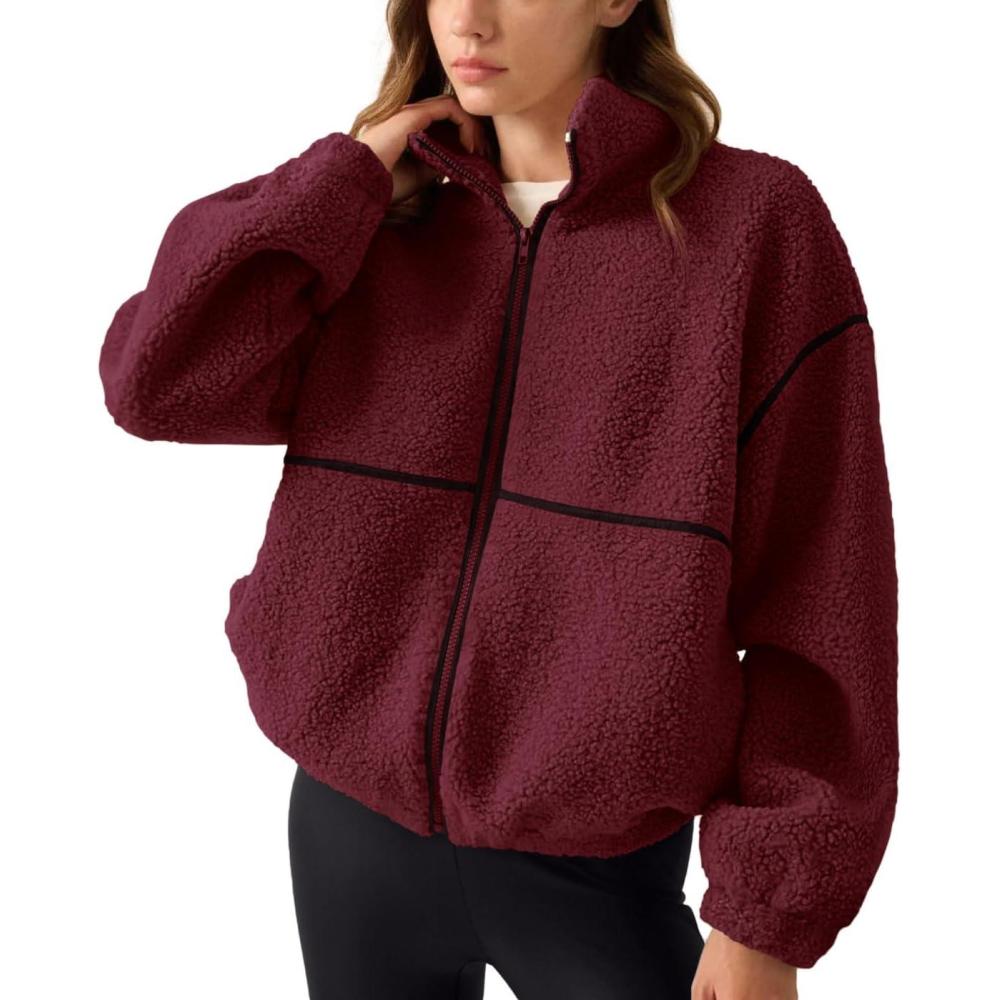 imageLASLULU Womens Fuzzy Sherpa Fleece Jacket Zip Up Oversized Sweatshirts Long Sleeve Winter Clothes Warm SweaterBurgundy