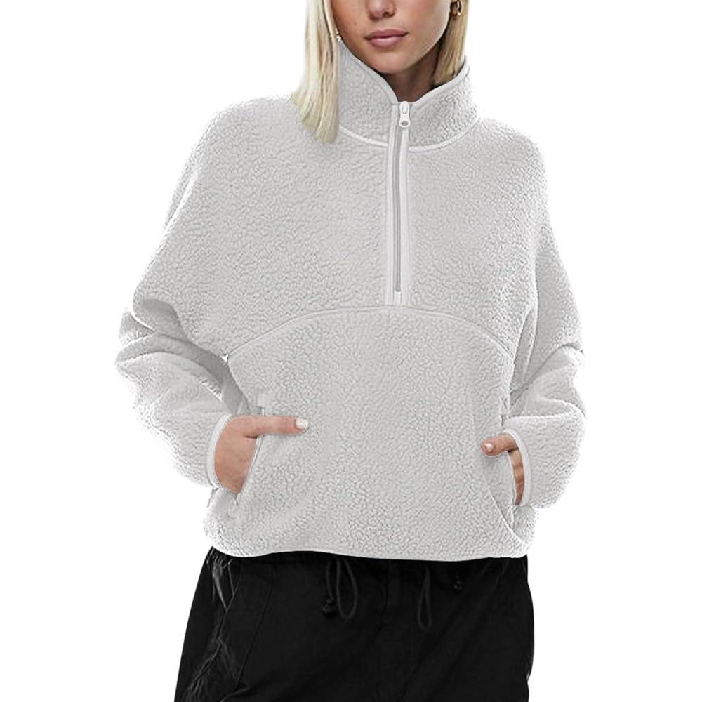 imageLASLULU Womens Half Zip Pullover Cropped Sweatshirts Sherpa Fleece Jacket Fuzzy Sweaters Cute Winter Jackets with PocketsLight Grey