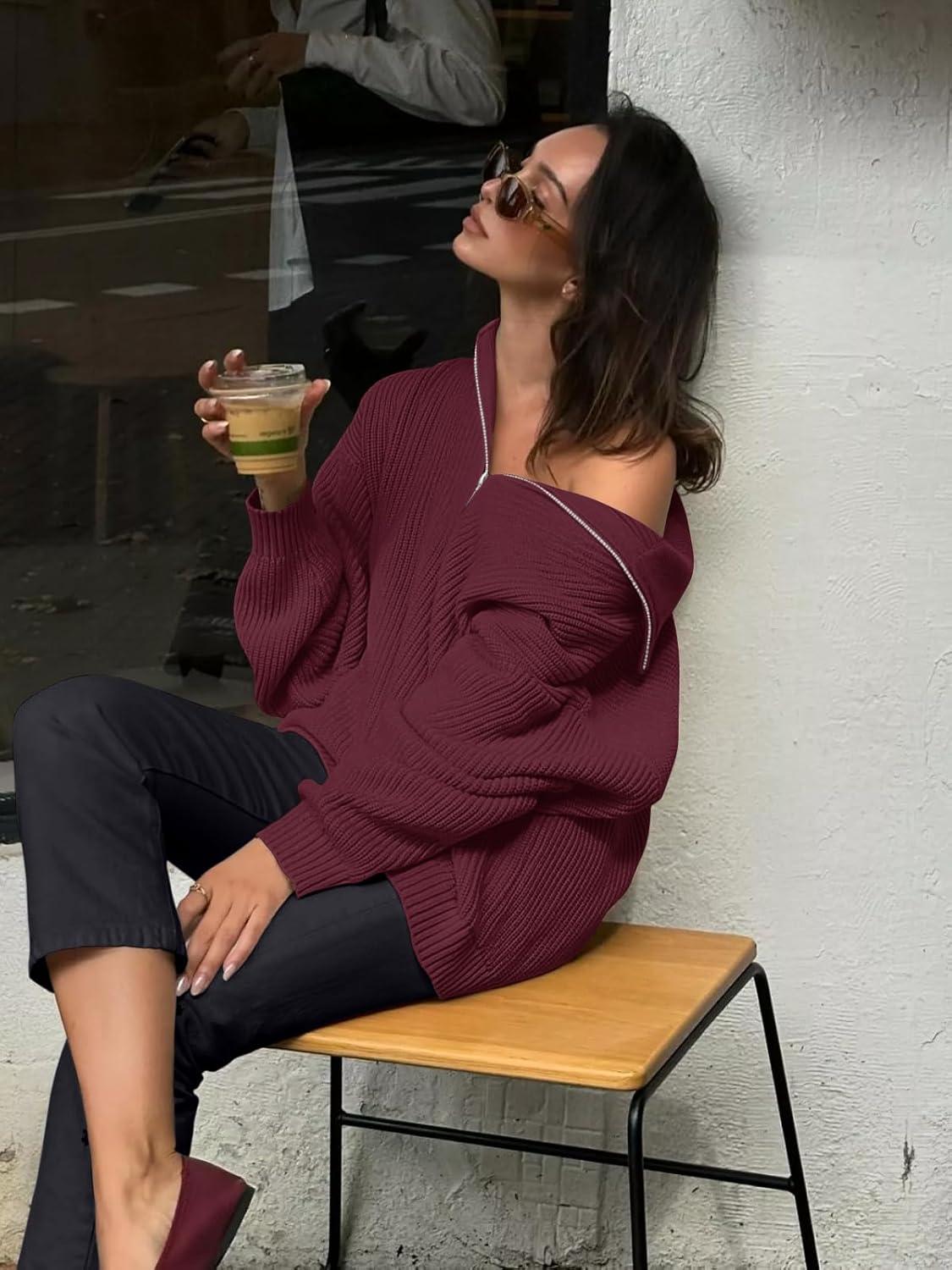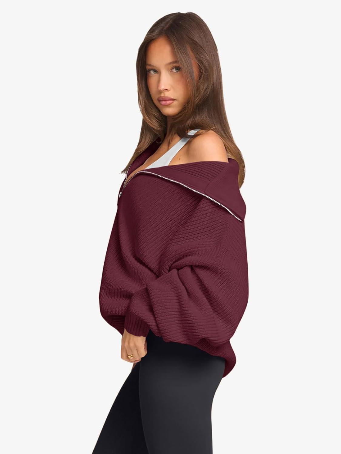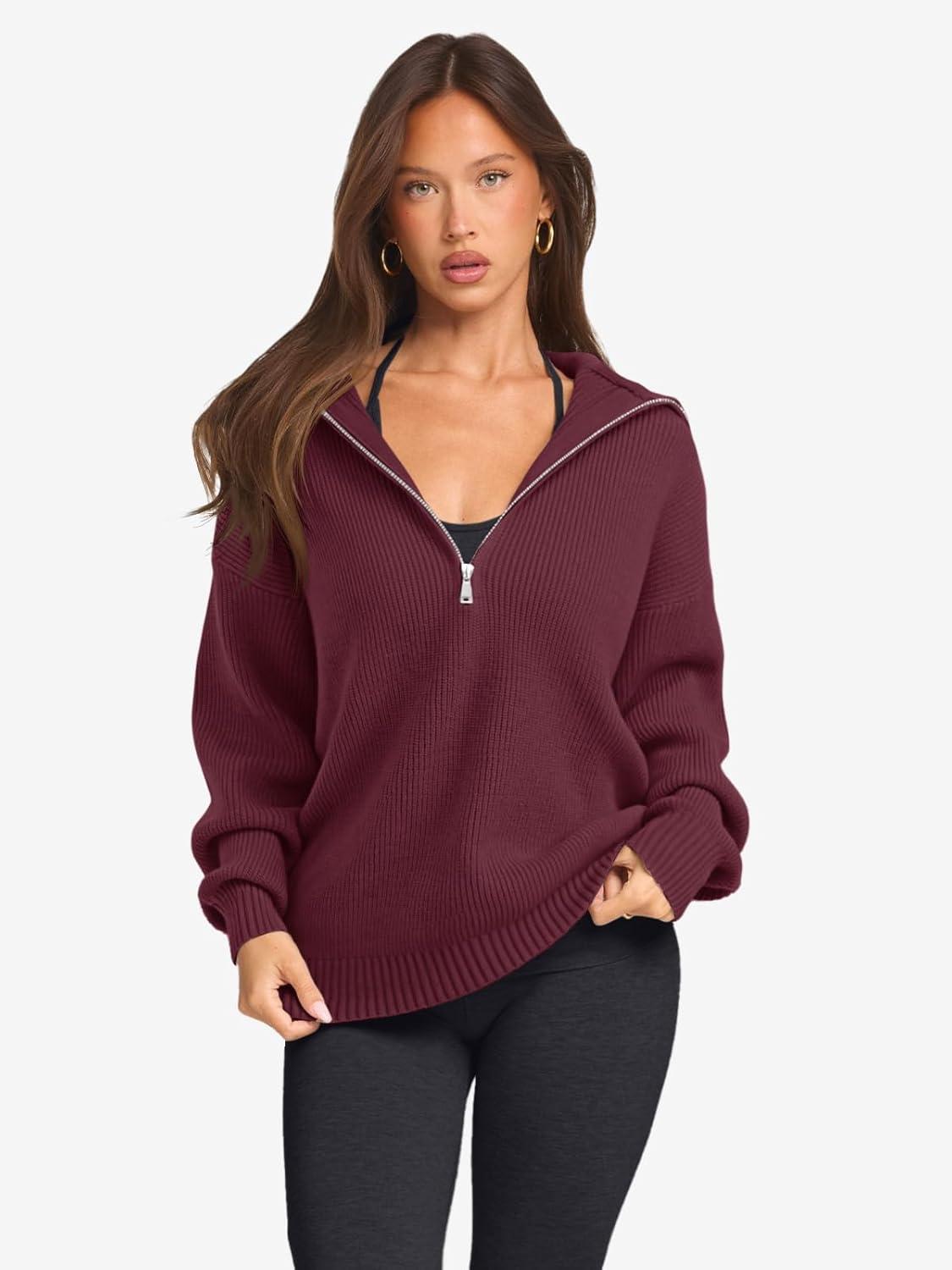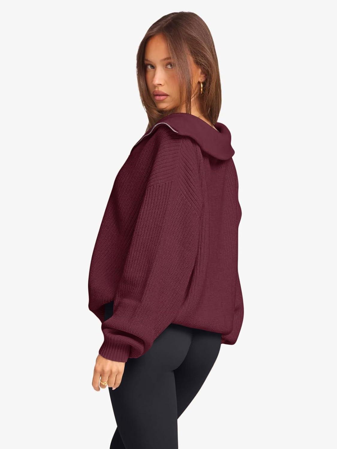 LASLULU Womens Half Zip Pullover Sweaters Oversized Long Sleeve Fall Winter Sweaters 2025 Trendy Clothes Outfits(Burgundy)