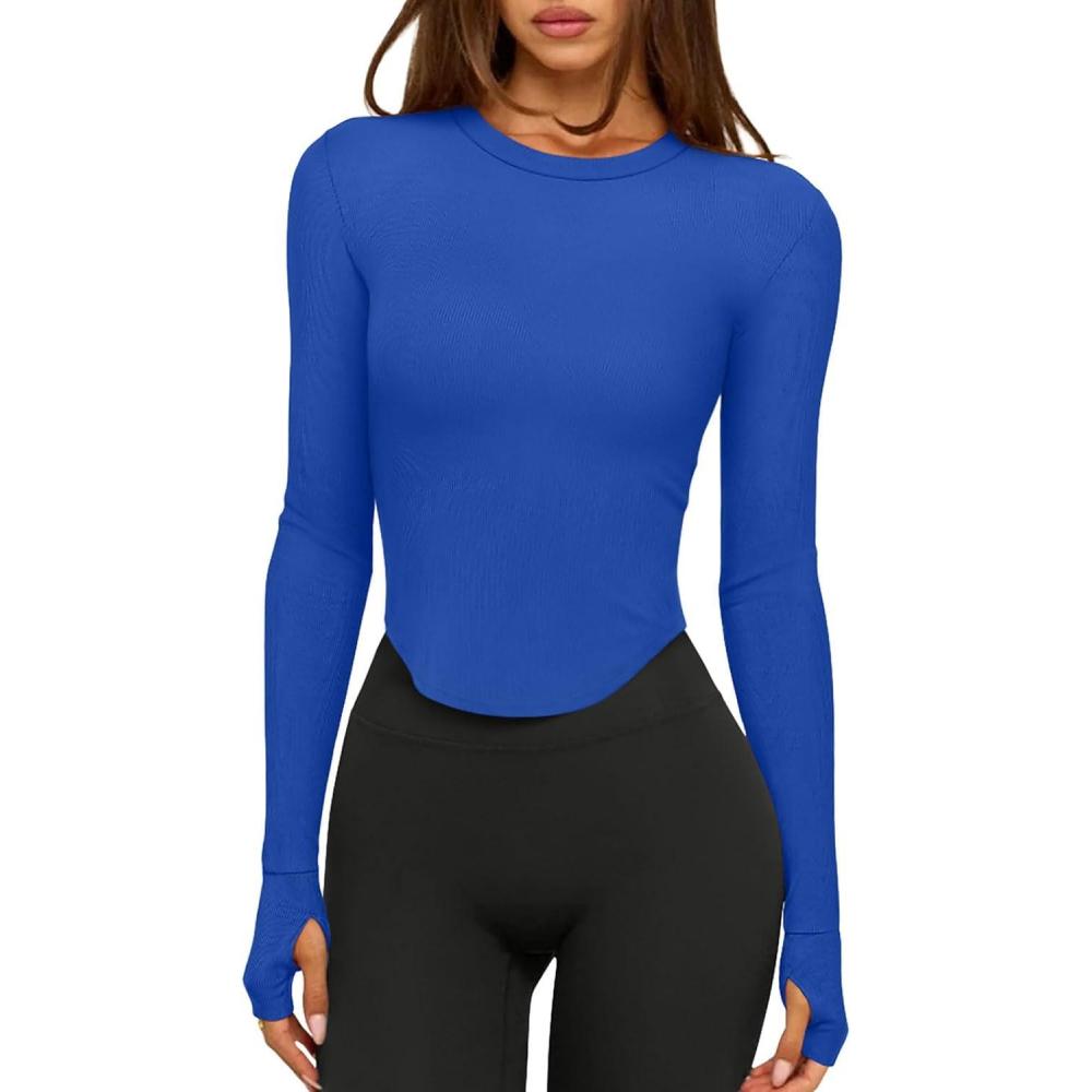 LASLULU Womens Long Sleeve Workout Tops Crop Tops Crew Neck Ribbed Slim Fitted Breathable Running Yoga Going Out T-Shirts(Klein Blue)