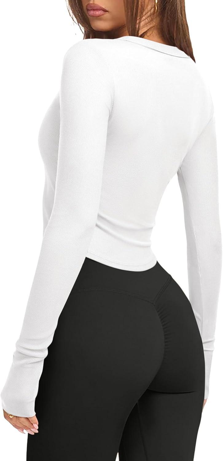 LASLULU Womens Long Sleeve Workout Tops Crop Tops Crew Neck Ribbed Slim Fitted Breathable Running Yoga Going Out T-Shirts(White)
