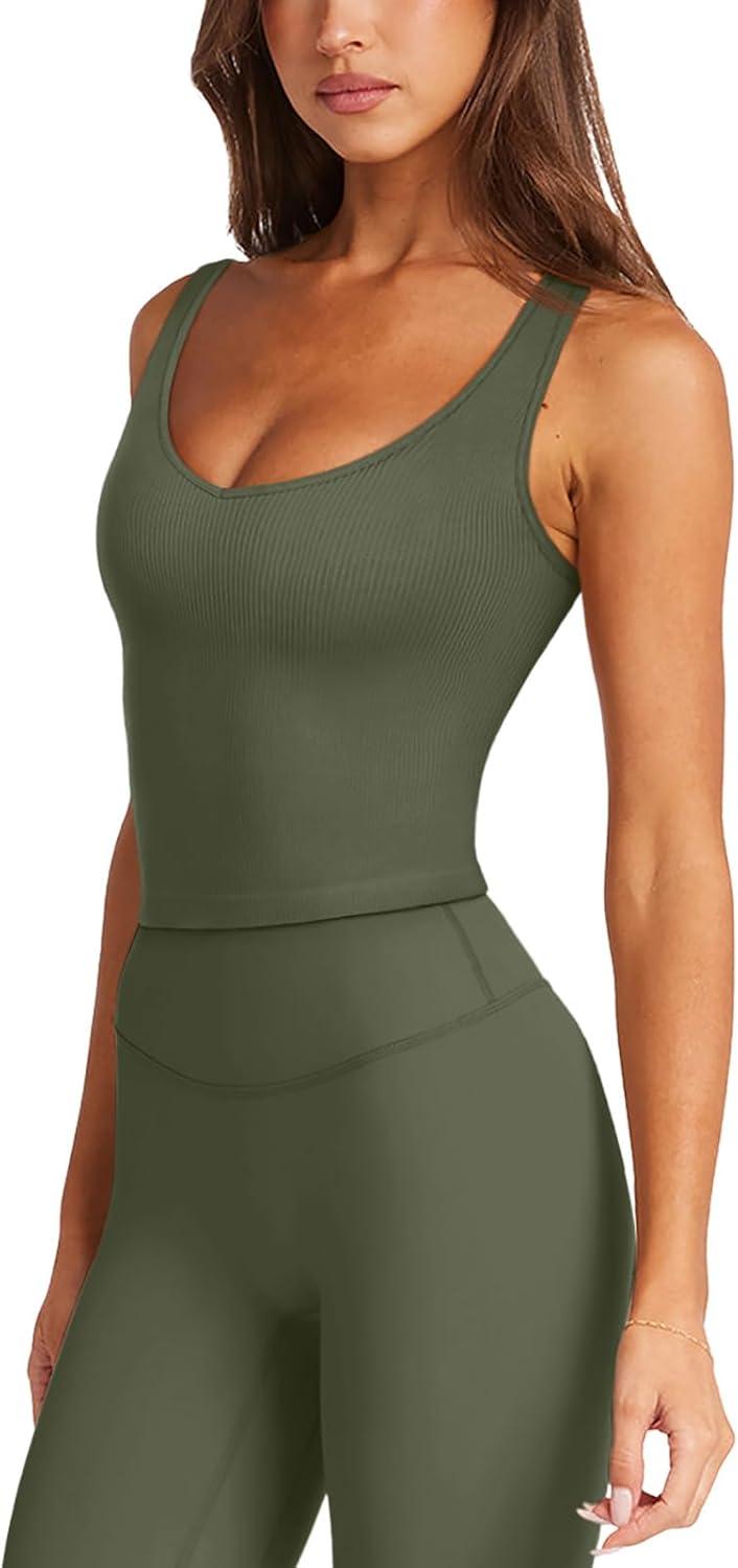 LASLULU Womens Longline Sports Bra Ribbed Seamless Wirefree Padded Tank Tops Medium Support Workout Tops Casual Crop Tops(Army Green)